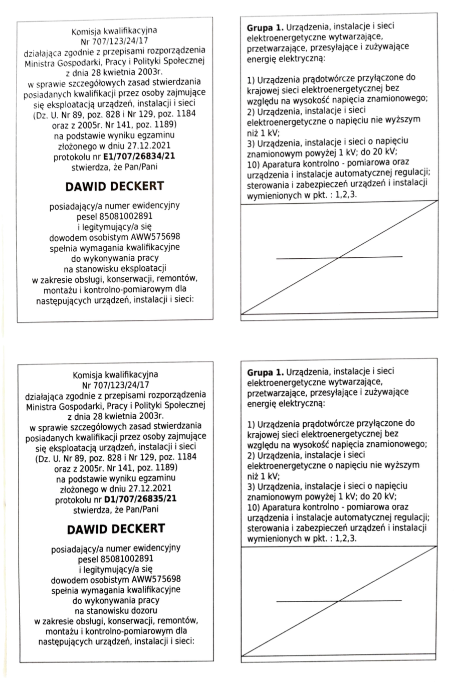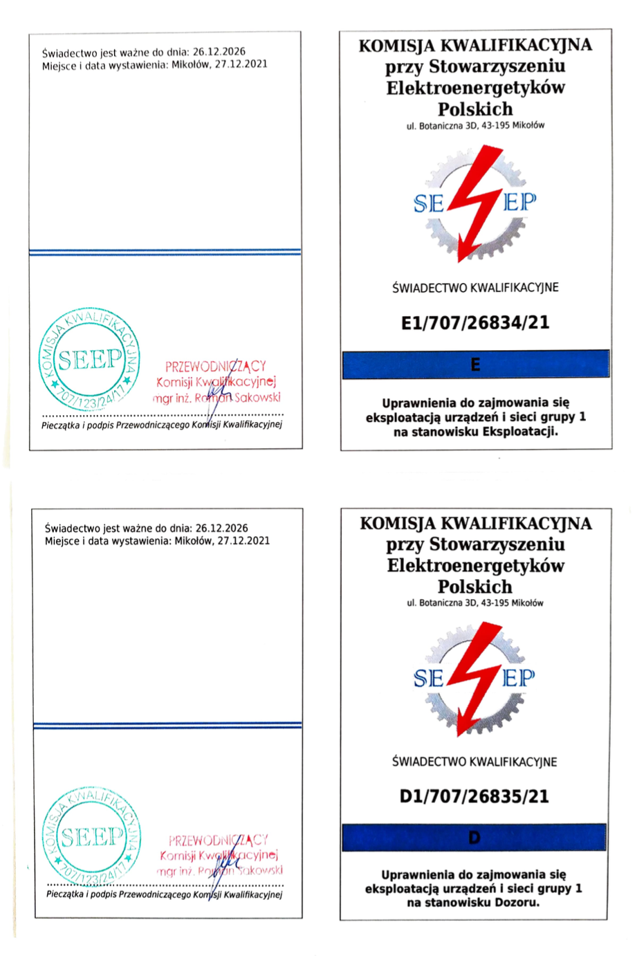 Posiadamy wszelkie niezbędne uprawnienia pozwalające do prowadzenia prac elektrycznych i wykonywania pomiarów elektrycznych.